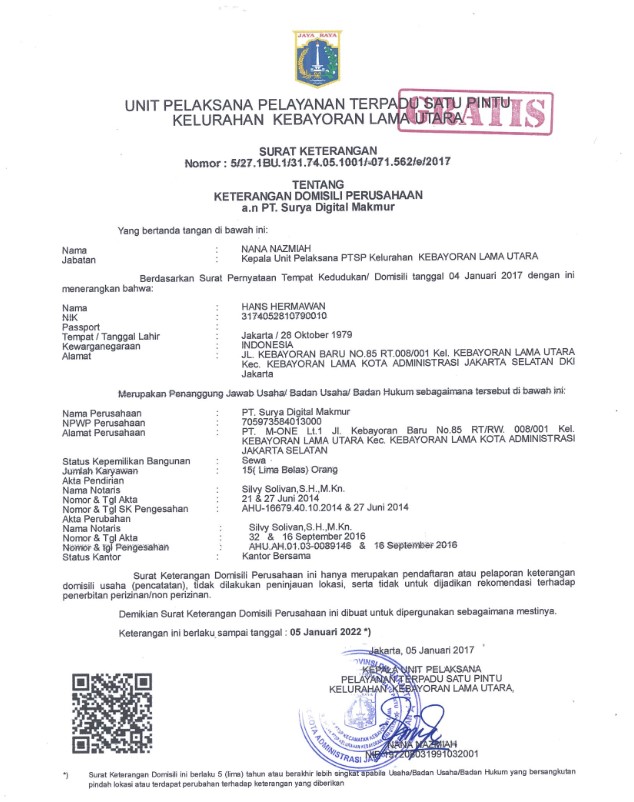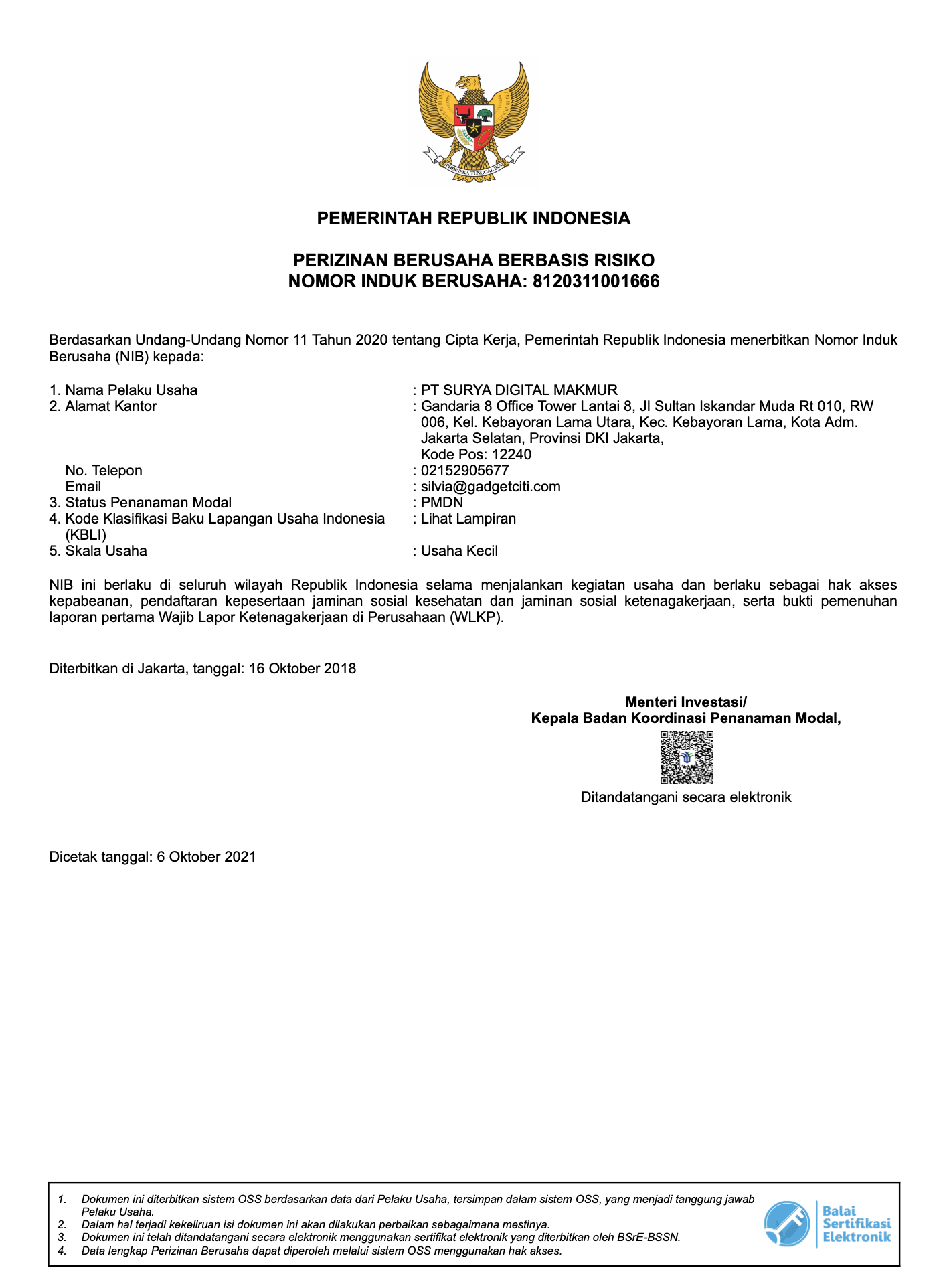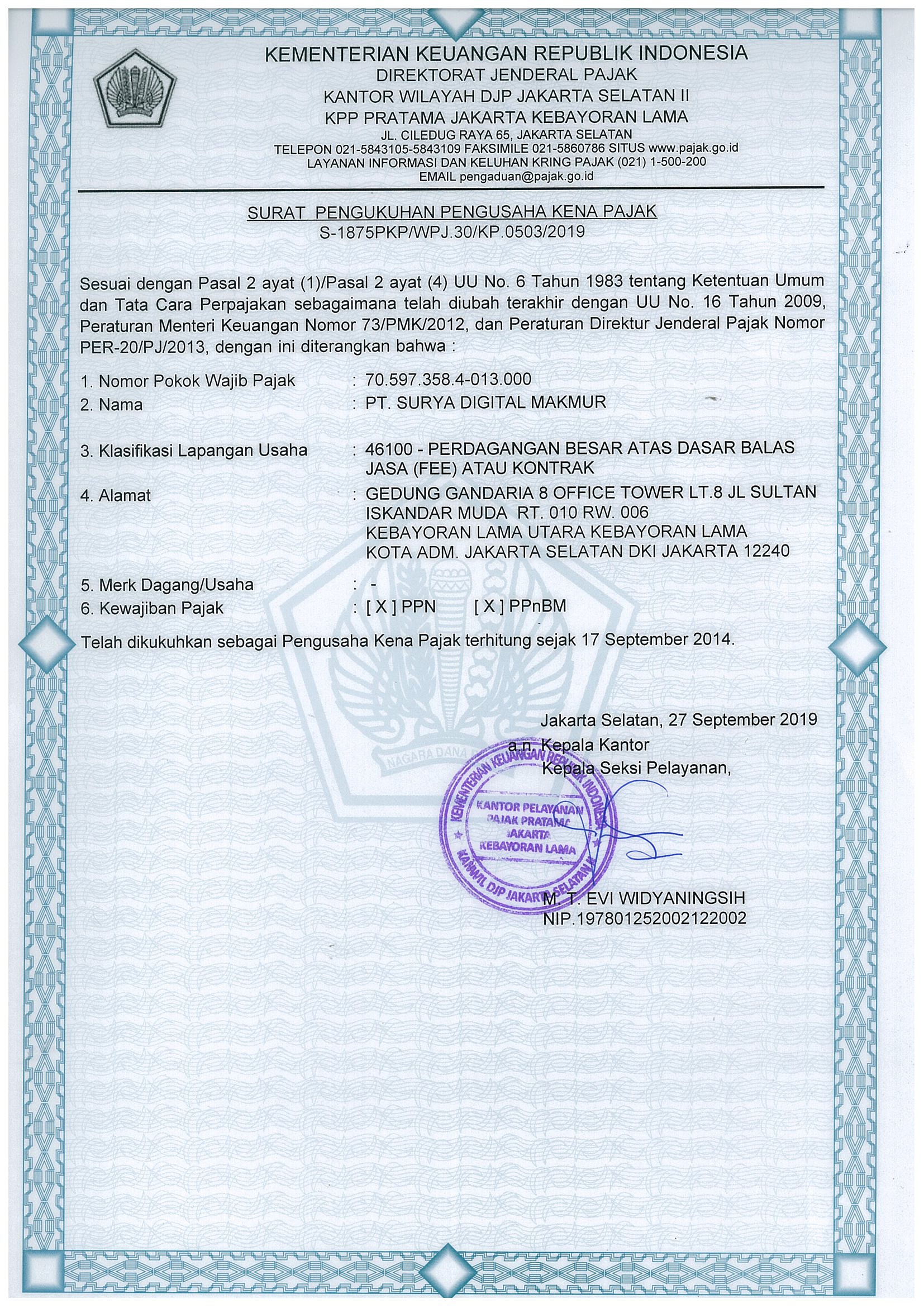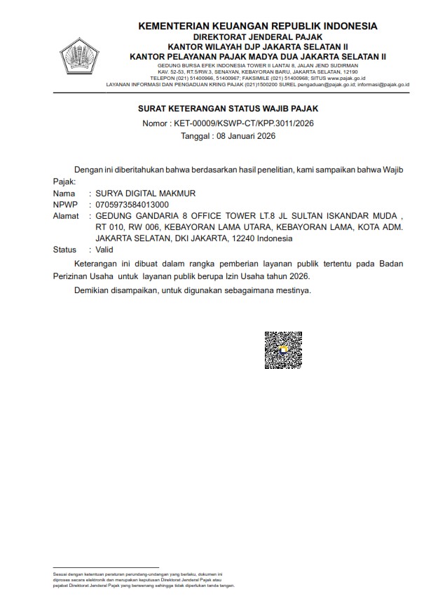 PT Surya Digital Makmur is a legally registered Indonesian company with complete business licenses, tax registration, and government procurement authorisation.